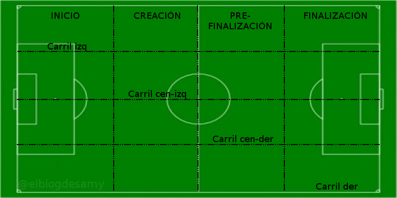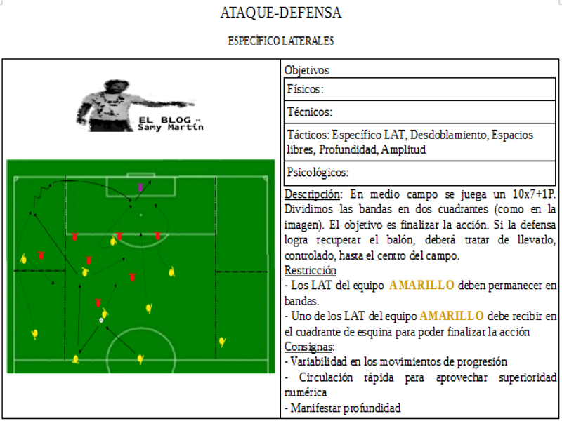 En esta entrada, la tarea propuesta es un ATAQUE-DEFENSA en medio campo donde trabajaremos de manera específica con nuestr@s laterales o carrileros. Está diseñada para la fase ofensiva en zonas de pre-finalización y finalización (ver división de zonas)