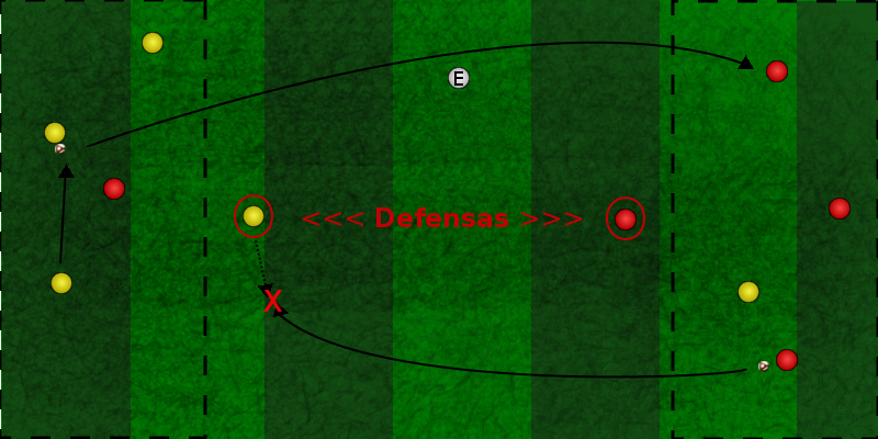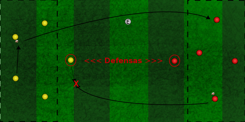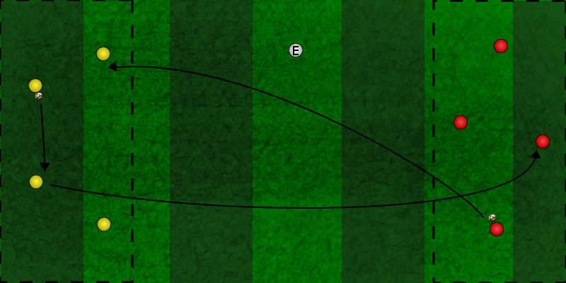 Lxs jugadorxs deben pasarse el balón en movimiento dentro de su espacio correspondiente. De manera inicial, a la voz del entrenador/a cada poseedor/a de balón en las zonas deberá ejecutar un pase aéreo hacia la otra.