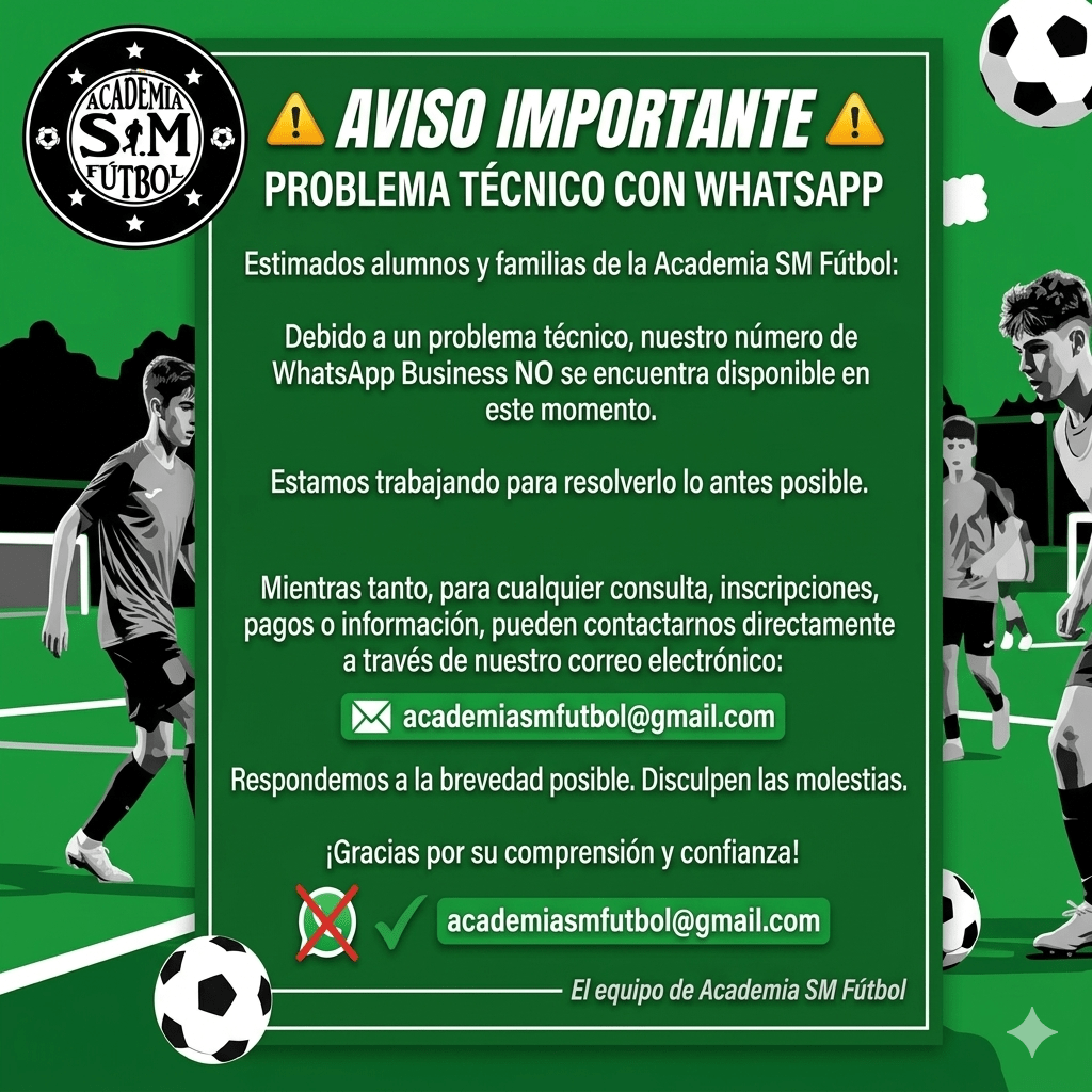 En SM Fútbol queremos informarles de que, debido a un problema técnico, nuestro número de WhatsApp Business no se encuentra disponible en este momento.