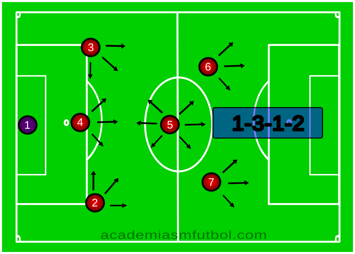 1 portero, 3 defensas, 1 mediocentro y 2 delanteros.